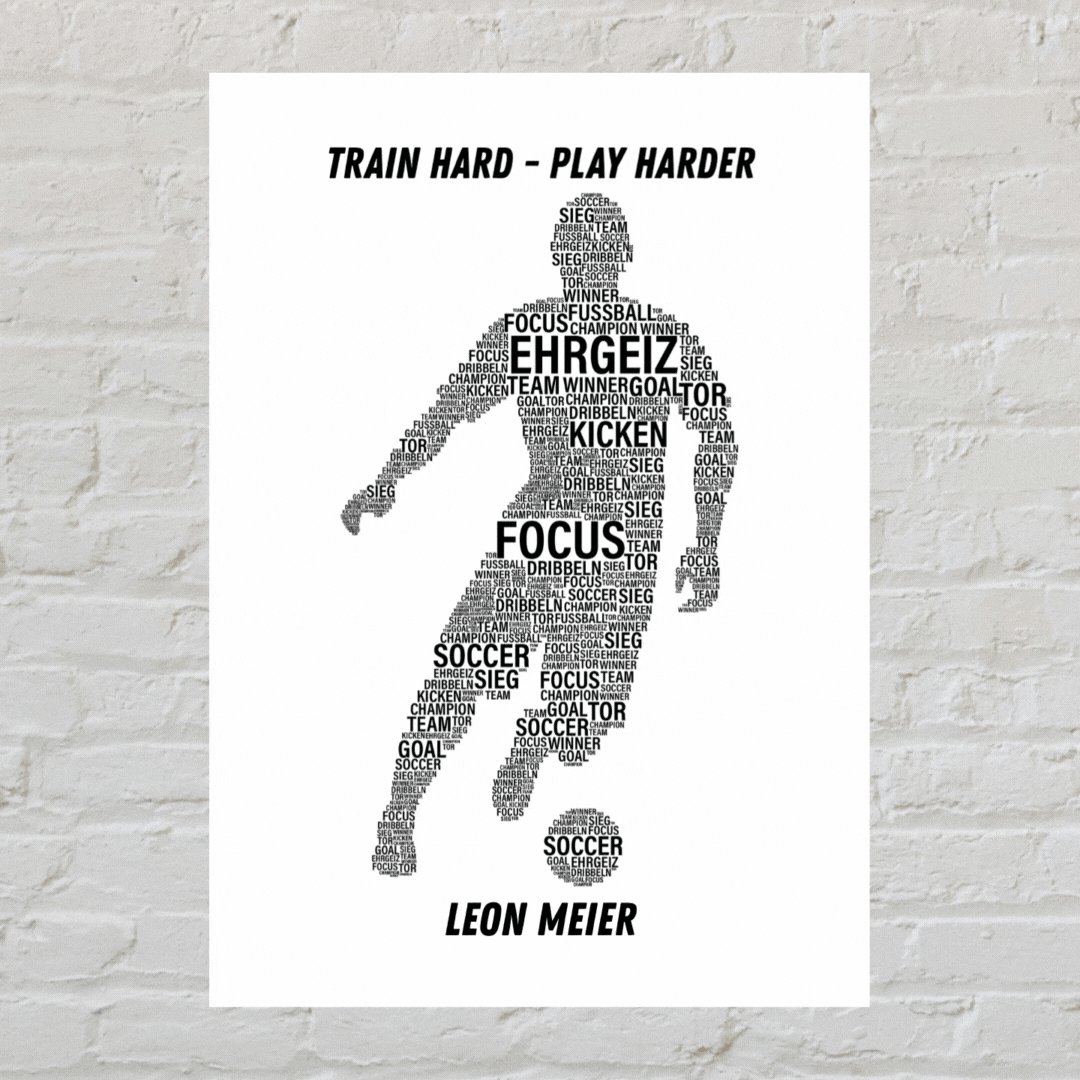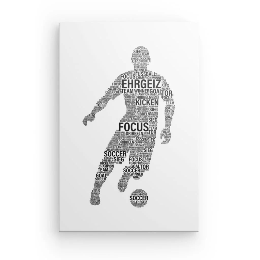 Diese hochwertige Leinwand zeigt einen dynamischen Fußballspieler, zusammengesetzt aus kraftvollen Begriffen wie Ehrgeiz, Fokus, Dribbeln, Sieg – und mittendrin: dein Wunschname oder der deines Fußballhelden.